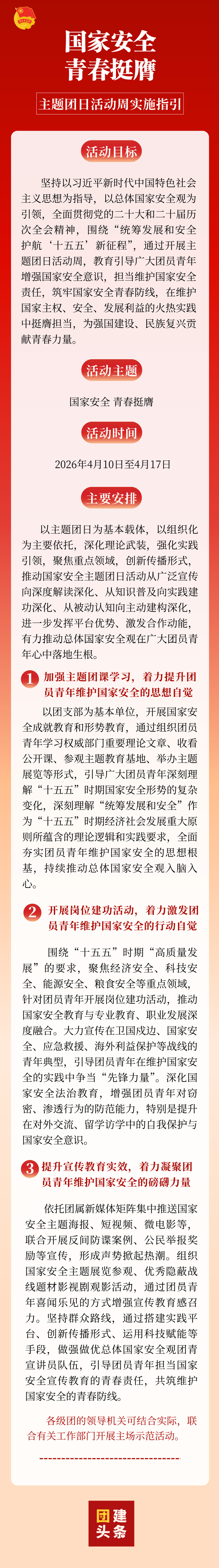 2026年是“十五五”规划的开局之年。为深入贯彻落实党的二十届四中全会精神,动员广大青年在护航“十五五”新征程中挺膺担当,在第十一个全民国家安全教育日来临之际,现就开展国家安全主题团日活动周提出实施指引如下。